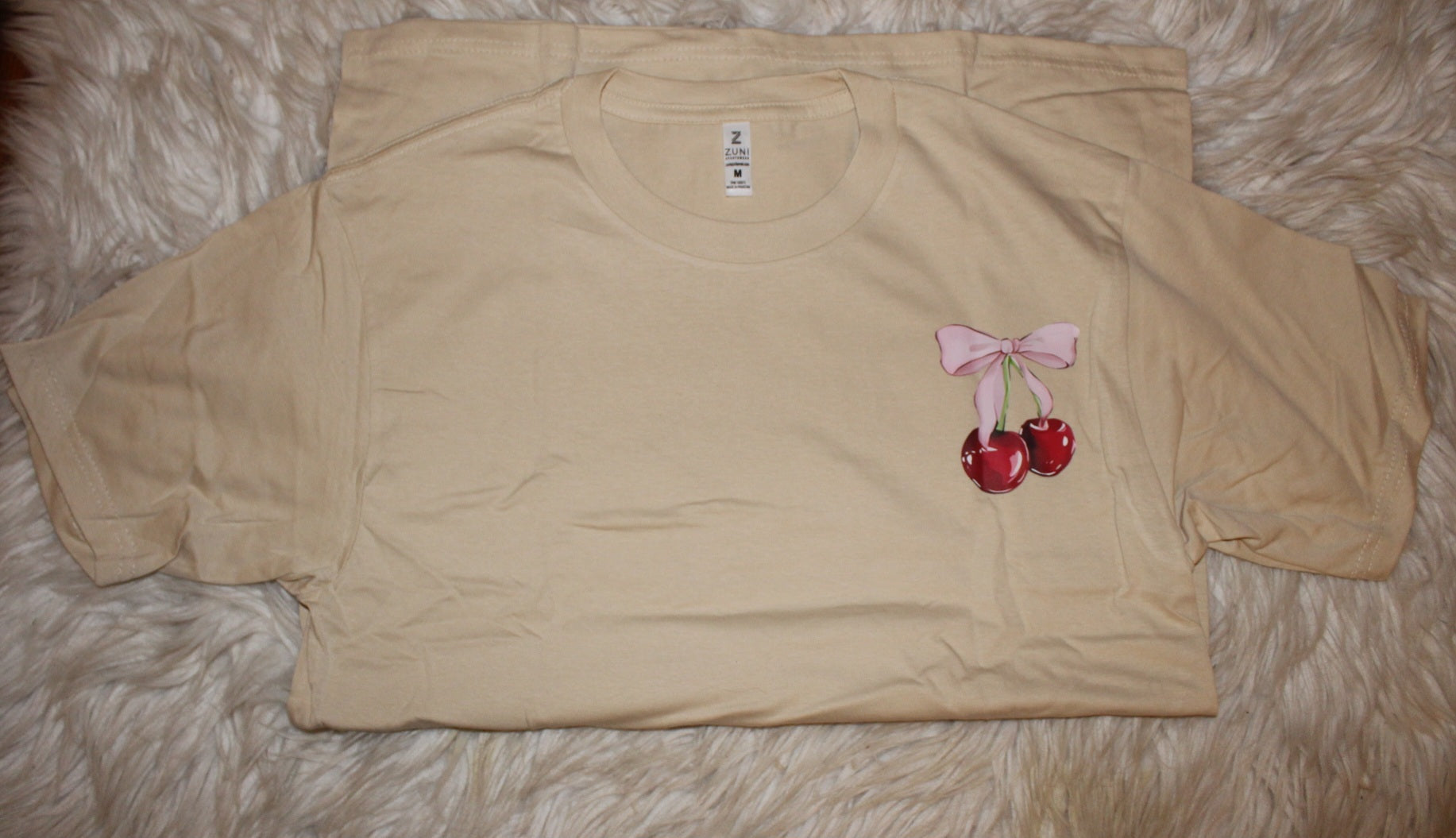 Featuring a glossy cherry-and-bow print on a soft neutral backdrop, this tee blends vintage sweetness with modern comfort. Crafted from 100% breathable cotton with a smooth heat-transfer design, it offers that perfect mix of lightweight ease and playful detail.