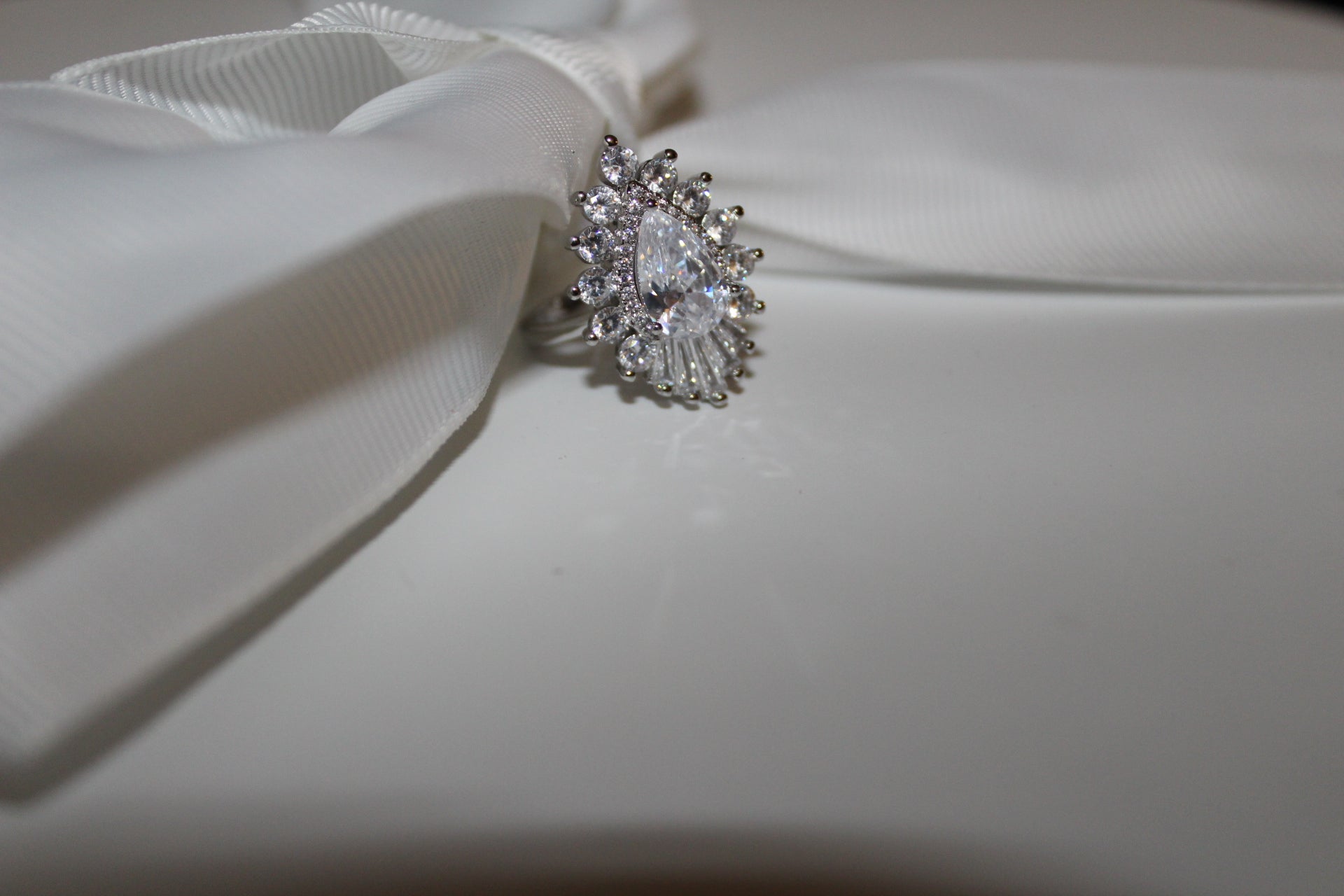 The Goddess Glow Halo Ring features a brilliant pear-cut cubic zirconia center, surrounded by a luminous halo of sparkling stones that create an effortlessly elegant, high-shine look. Finished in a sleek silver-tone (white gold–tone plated), this ring feels both timeless and bold — perfect for everyday magic or special moments.